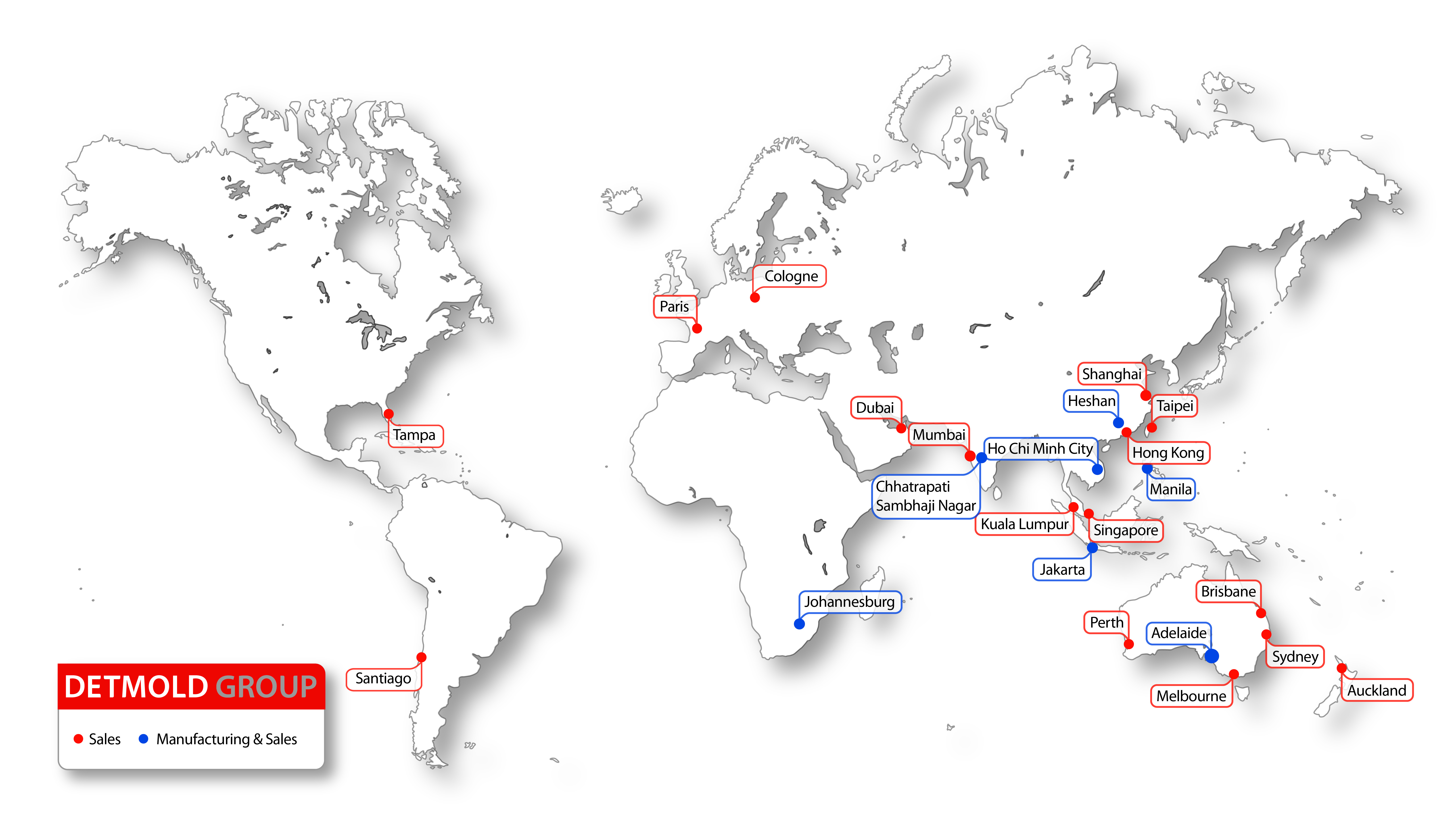 Detmold Group has 24 sales locations across Australia, New Zealand, the United States of America, Singapore, Indonesia, Malaysia, the Philippines, Vietnam, Thailand, China, Hong Kong, Korea, Taiwan, India, South Africa, the United Arab Emirates, France and Chile. Owned manufacturing spans seven countries, alongside a global sourcing team.